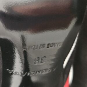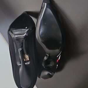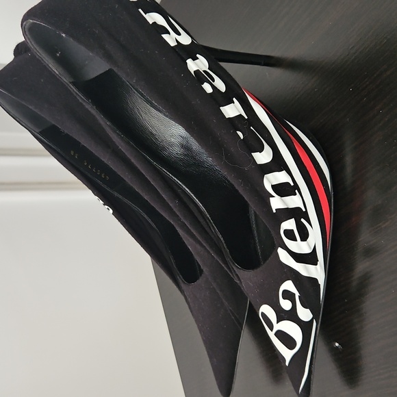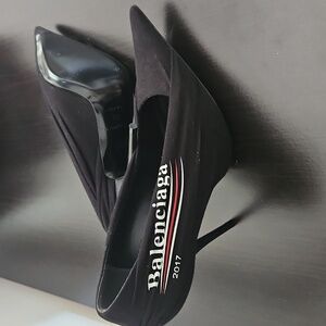 Balenciaga pointed black printed pumps. side Balenciaga Logo. Size 8, runs big, 8 wide/ 8 1/2 would have a better fit. Heel 4 1\2 inches. Soft jersey material outer lining. ****SOLD*******SOLD *****