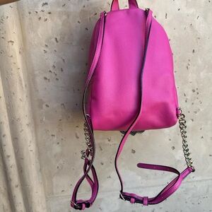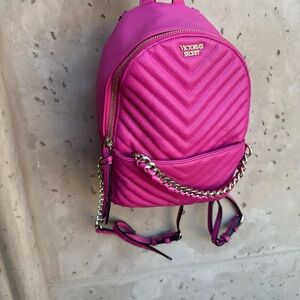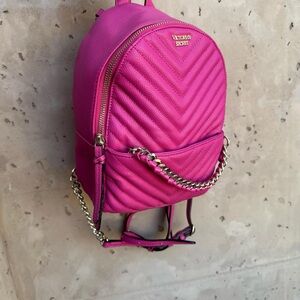 This stylish pink backpack showcases a unique chevron quilted design that adds a touch of sophistication. Crafted from a smooth leather-like material, it is both fashionable and functional for daily use. The eye-catching silver-toned chain detail elevates its overall aesthetic, making it a must-have accessory.