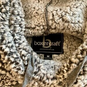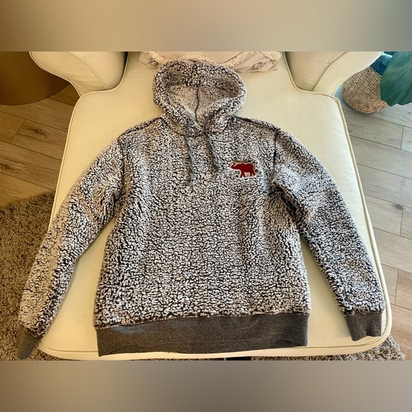 Warm and stylish sherpa hoodie. Features a cute bear patch. Perfect for chilly days.