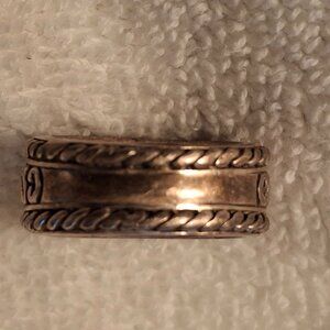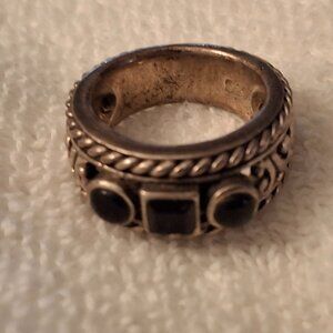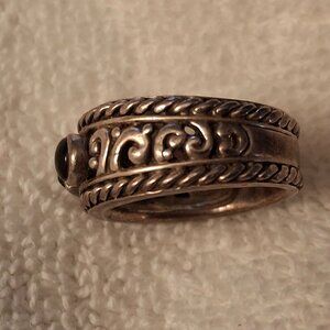 Barse stamped .925 Sterling and Garnet Ring with 3 black stones, rope and scroll detail around the ring. This ring is thick and solid.