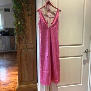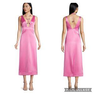 Embellished halter straps bring a unique twist to this sleeveless satin midi.