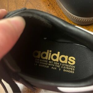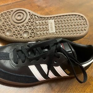 Classic Adidas Samba sneakers in black and white. Features iconic three stripes design with velvet detailing.