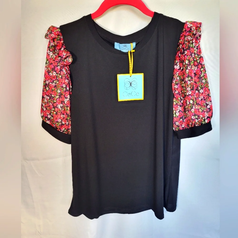 Stylish slinky strechy black top featuring vibrant dark floral sleeves. Sleeves are sheer with some metallic tinsel for some extra elegance. Perfect for any occasion.