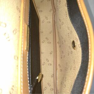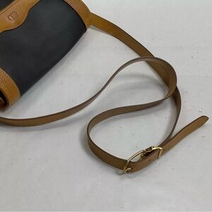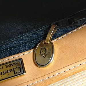 Stylish Navy and tan Christian Dior crossbody bag perfect for any occasion. Features a sleek design with a convenient strap for easy carrying. She is Grade A. Obviously Vintage, but perfect condition. Does have slight brass coloration on strap from old hardware. Comes with wallet that can be buttoned into the bag.