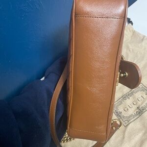 The small GG Marmont camera bag has a softly structured shape and a flap closure with Double G hardware. The sliding chain strap can be worn multiple ways, changing between a shoulder and a top handle bag. Made in matelassé chevron leather with a heart on the back.