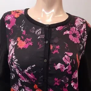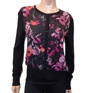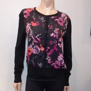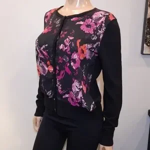 Chic stretch knit cardigan with a floral patterned sheer chiffon layered front panel. Perfect addition to your spring wardrobe.