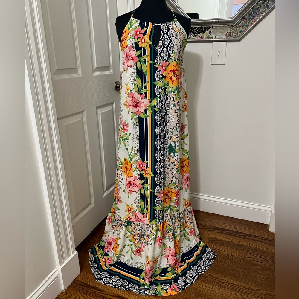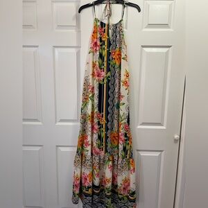 Flying Tomato Floral print maxi dress with keyhole neckline and halter tie up and low back. Adjustable neck. Beachy vacation vibes. Not lined/ Great for beach