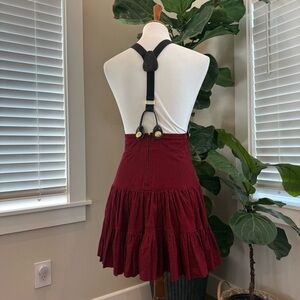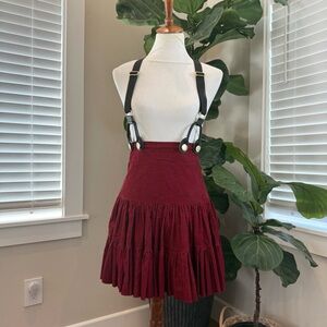Betsey Johnson Suspender Skirt with a red and black houndstooth print and gold buttons on the suspenders. Zipper up the back. Tagged a size 2. The buttons on the back have some cuff but otherwise it’s in great condition.