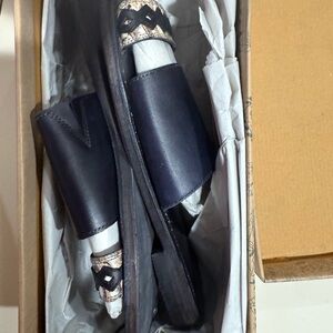PRODUCT FEATURES YOU’LL LOVE: Leather upper. Leather lining and insole. Slip-on style. Open toe. Two-strap vamp design with plain wide back strap and embroidered front strap. Stacked heel. Leather outsole. Imported.