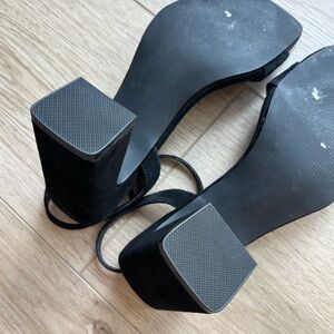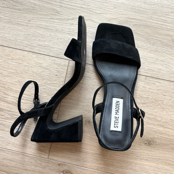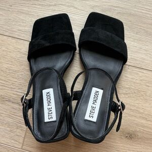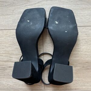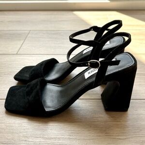 Block heel, adjustable ankle strap, faux suede material, very stylish and comfy!