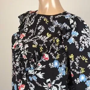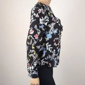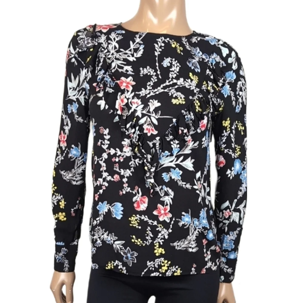 Elegant floral top featuring a vibrant floral design on a black background. Perfect for work or any occasion, tucked in or worn loose. Lightweight and flowy, with a flirty ruffled trim and sophisticated buttoned cuffs.