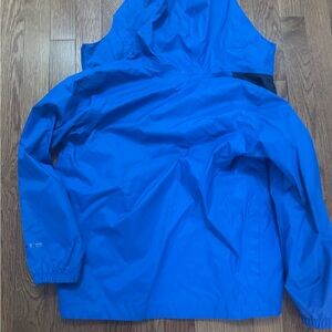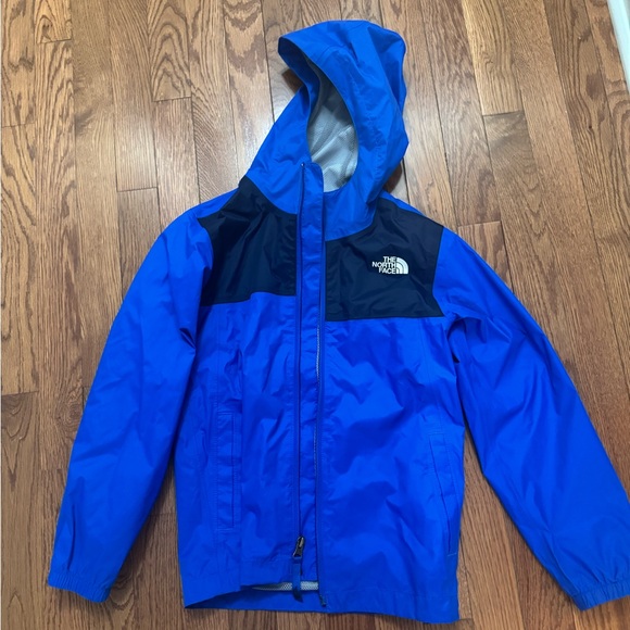 Stay dry and comfortable with The North Face raincoat, featuring a vibrant blue color and a protective hood. Crafted from water-resistant material, this raincoat is perfect for outdoor adventures in wet weather. The iconic brand logo adds a touch of style to this functional piece.