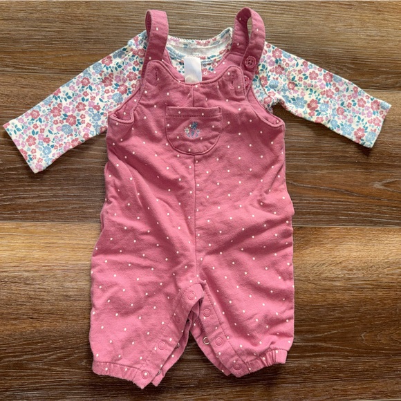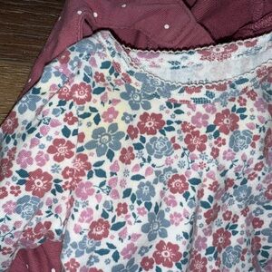 Floral overall outfit. One of my favorites!!! The undershirt has some slight yellowing in 2 spots, untreated so it might come out. I think it’s from being stored. There’s a spot on the sleeve (pic #2) and then a spot on the left chest (pic #3), the spot on the chest is hidden by the overalls so you can’t see it when they’re paired together. Smoke free/pet friendly home!