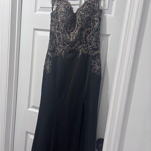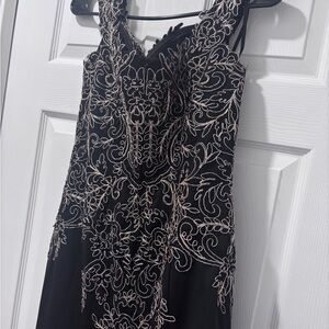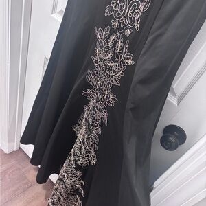 This stunning dress features intricate gold embroidery on a classic black background, perfect for any special occasion. The elegant design and luxurious fabric make it a standout piece in any wardrobe.