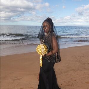 This universal dress, golden bouquet, black goddess veil is by far a popularity statement it has been wore once when I married 2021 it’s not your typical would advise wearing multi-ways you can ;) AS SHOWN (includes everything bundle deal.