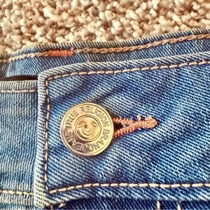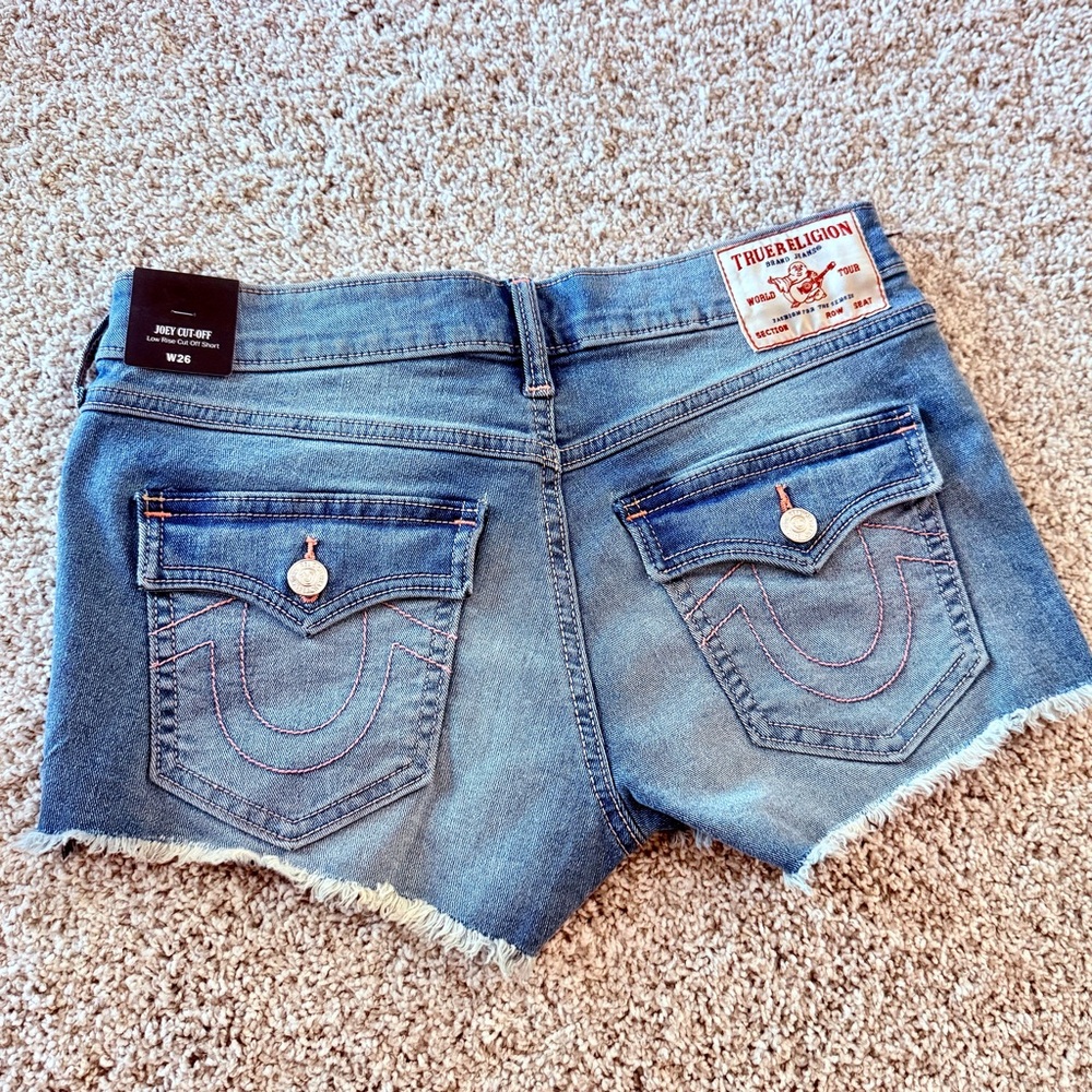 These True Religion jean shorts feature a light blue denim with a vintage worn look. The frayed hem adds a casual, laid-back vibe, making them perfect for relaxed summer days.