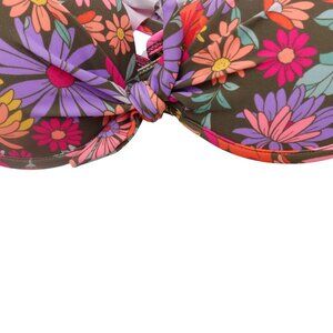 - Tie closure at back; adjustable ruffled straps crisscross at back