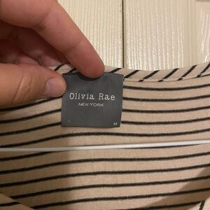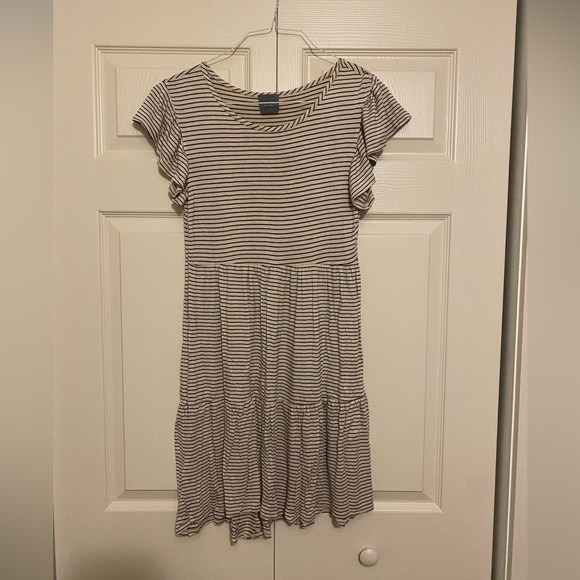 Beige/tan dress with black stripes. This dress is a comfy tshirt dress material. Vary stretchy