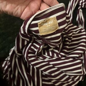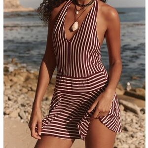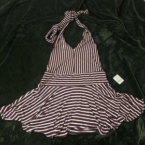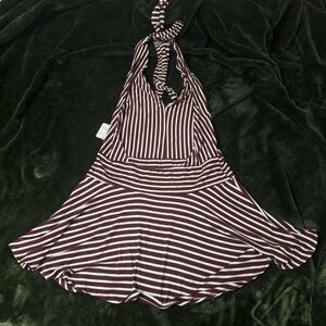 - plunge neckline, dropped waist seam, open back, classic striped pattern throughout