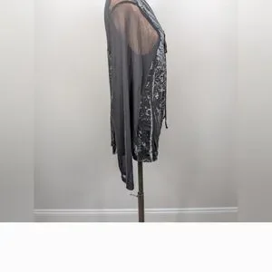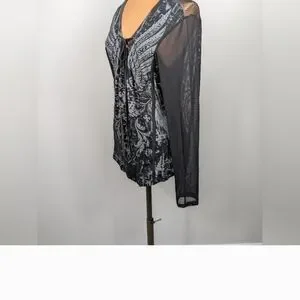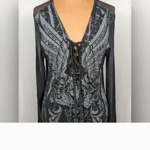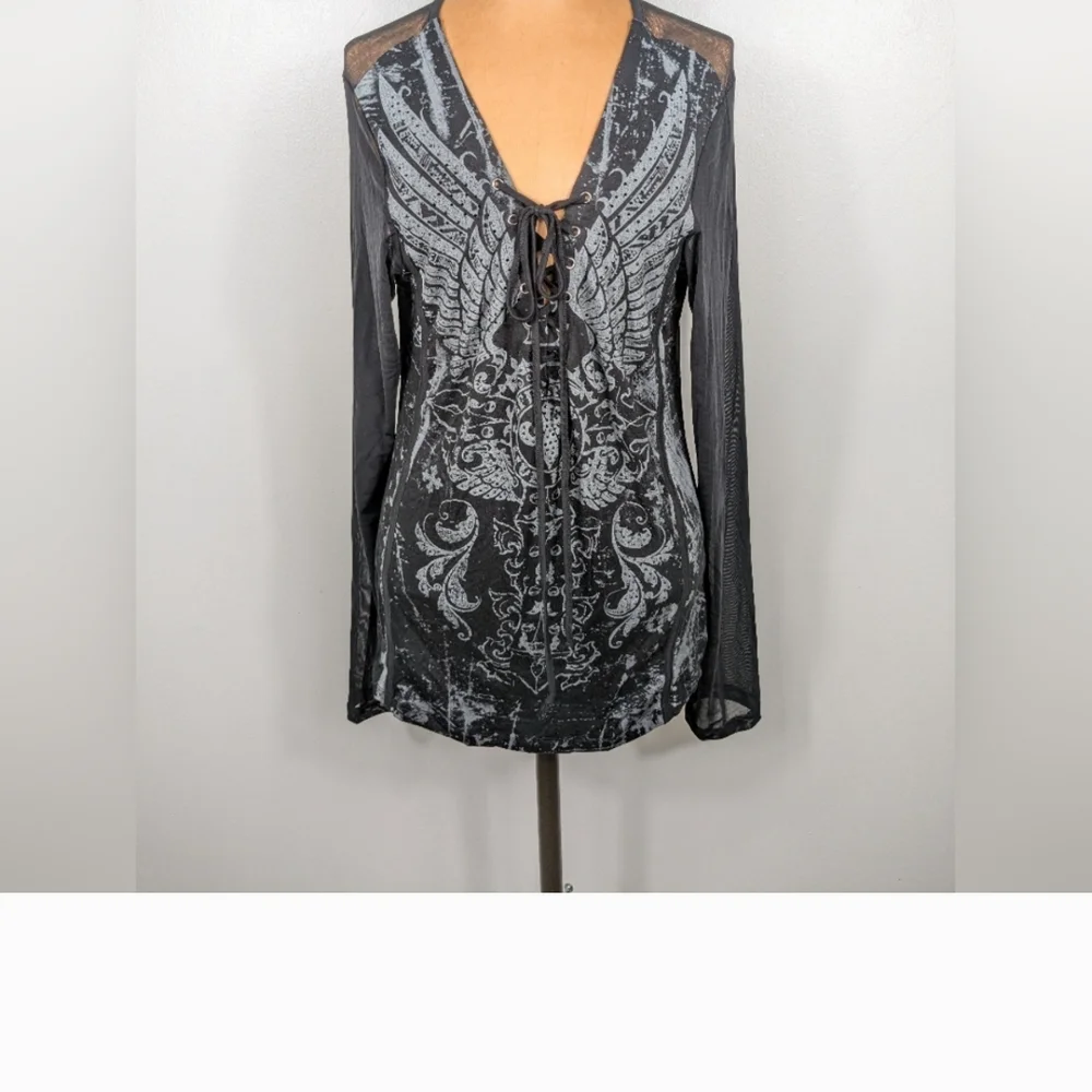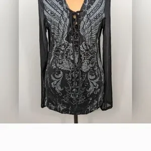 Stylish Affliction black and gray women's top featuring a lace-up front. Perfect for a chic and edgy look.