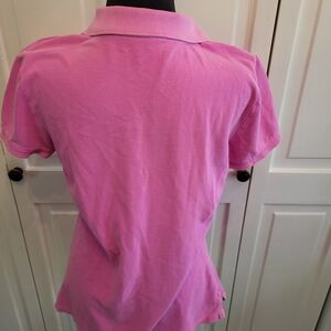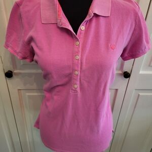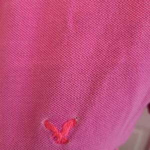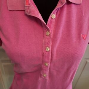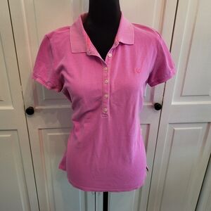 Vintage y2k American Eagle Pink Polo with 7 buttons on placket, cap sleeves, and a slim fit. Logo has some undone stitching and shirt has some wash wear but overall in good condition. Tag is missing. Please see measurements