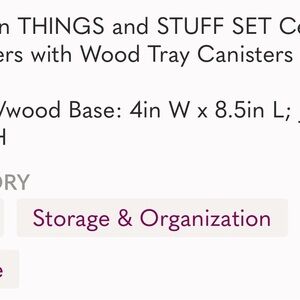 Set of two black canisters labeled 'Things' and 'Stuff'. Comes with a wooden tray. Perfect for organizing bath essentials.