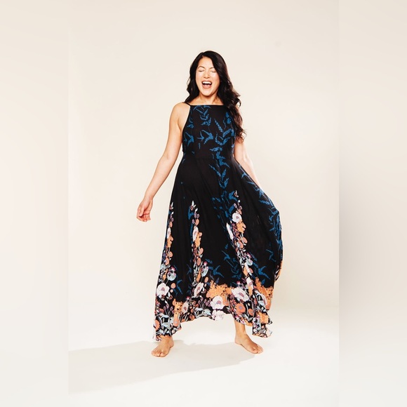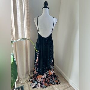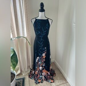 Elegant black dress with vibrant floral patterns. Perfect for any occasion.