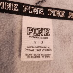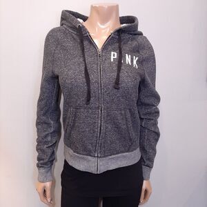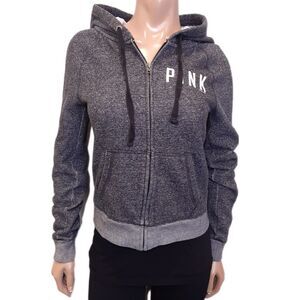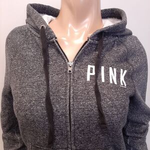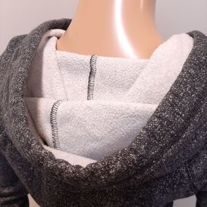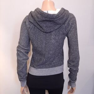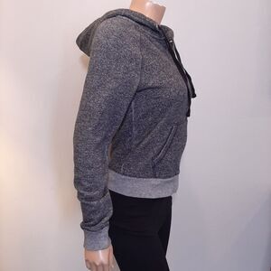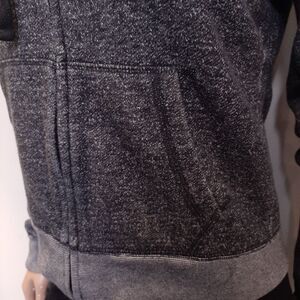 Features: Heathered gray with contrast cuffs & hem, raglan cut sleeves, drawstring hood, front pockets
