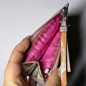 Stylish green wallet with pink trim and keychain attachment. Perfect for on-the-go convenience. Beautiful vintage pink keychain wallet , has minor staining on the inside. clip or charm included chosen by me. May be different then in photo.
