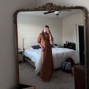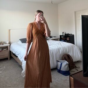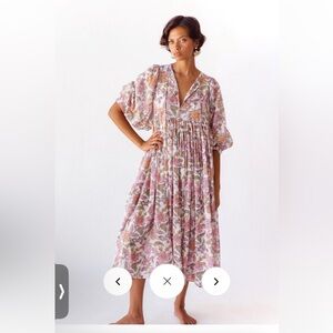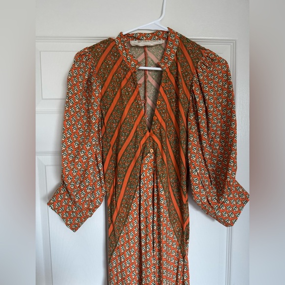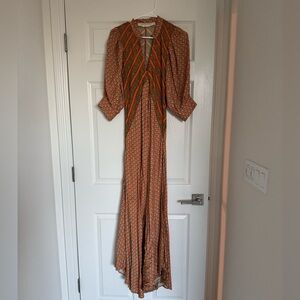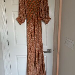 This stunning Jen's Pirate Booty Roma Saloon Maxi Dress is perfect for any occasion. The dress features a V-neckline and button closure, with a long dress length and half balloon sleeves. The dress is made from lightweight viscose material, which makes it perfect for summer, fall, and spring seasons. The dress is available in size small, and the multicolor geometric pattern adds a touch of bohemian and colorful design.