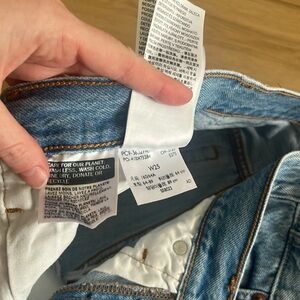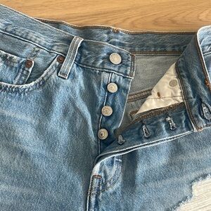 Levi 501 high rise distressed shorts. Material is a softer denim feel, not as stiff, a little bit of stretch. So cute!