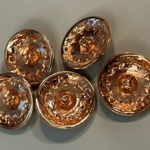 Lot of St John buttons (5) from a Collection jacket. Gold-tone with dark red shimmering enamel. Five identical measuring approximately 1” and in excellent condition.