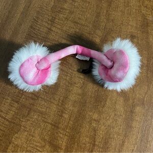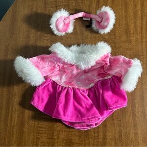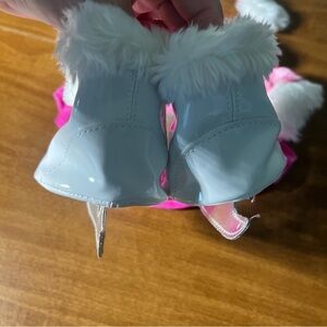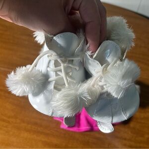 • Pink with white faux fur top, matching ear muff headband and white faux leather & fur ice skates