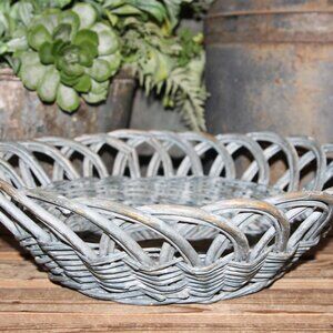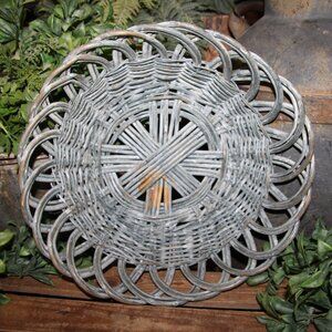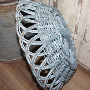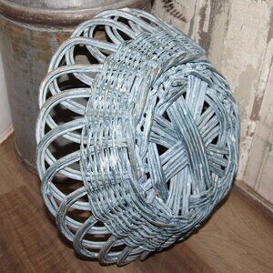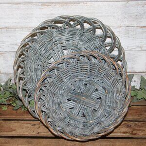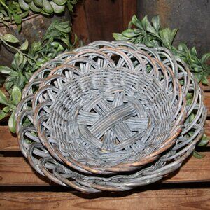 NEW pair of 4" tall x 15" wide/deep and 3.5" tall x 12" wide/deep nesting wicker basket dishes with shabby blue-gray washed patina. Pretty design and ornate weave. Perfect for Shabby Chic, French Country or farmhouse cottage decor/storage!