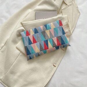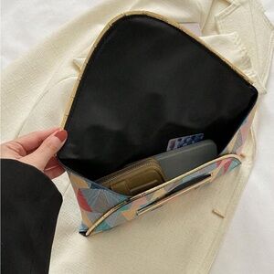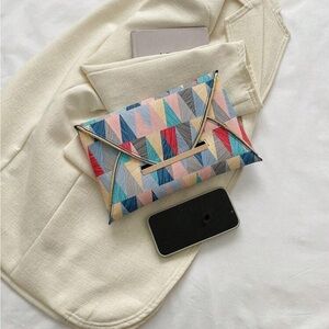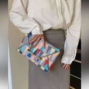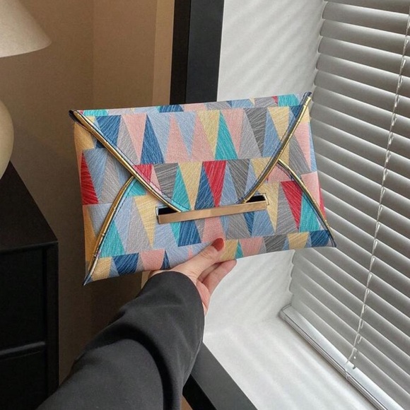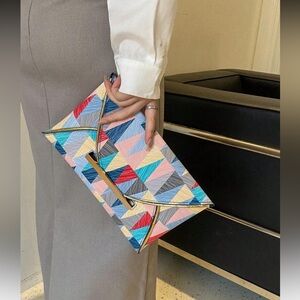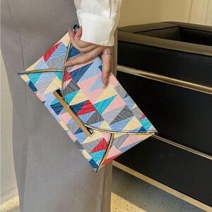 Stylish clutch with a vibrant geometric pattern. Perfect for adding a pop of color to any outfit. 100% polyurethane