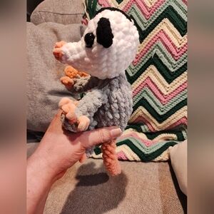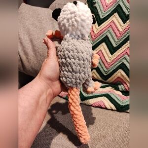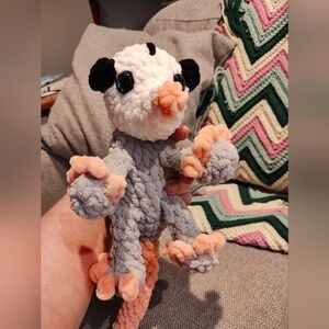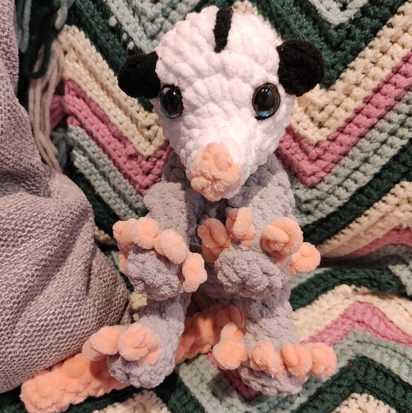 Charming handmade opossum with a soft gray body and peach details. Ideal for snuggling.