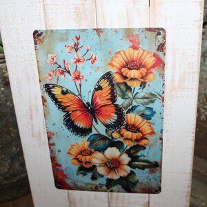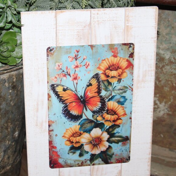 NEW custom made 18" tall x 12" wide reclaimed wood and metal butterfly and floral wall decor sign. Distressed white reclaimed, planked wood with very colorful 8" x 12" metal sign at center. Hanging hardware at rear! Pretty, one of a kind piece for French Country, cottage, BOHO or moody farmhouse wall decor!