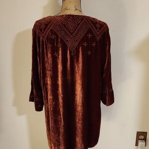 Offers welcome on this v-neck velvet top from Johnny Was featuring a vibrant rust hue with matching rust embroidery, perfect for an effortlessly stylish look. The 3/4 sleeves add a touch of elegance, making it a versatile addition to any wardrobe. Its flowing design ensures a flattering silhouette for any occasion.