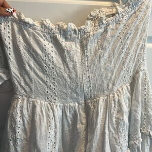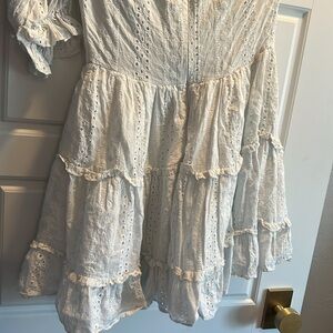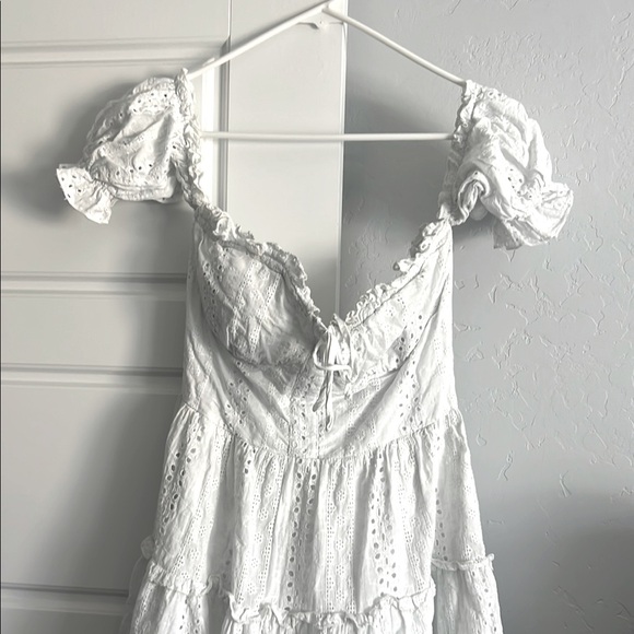 This charming sundress features a pure white hue, puff sleeves, and a sweetheart neckline, making it an ideal choice for a bride or wedding guest. The short sleeves and mini length add a playful touch, while the fitted bodice and A-line skirt create a flattering silhouette.