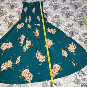 Elegant teal dress with floral accents. Features a smocked bodice. 100% Rayon Scoopneck Excellent condition Smoke and pet free home E