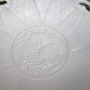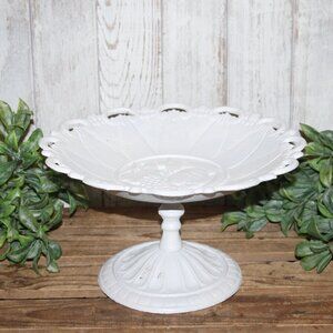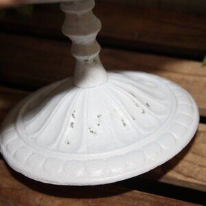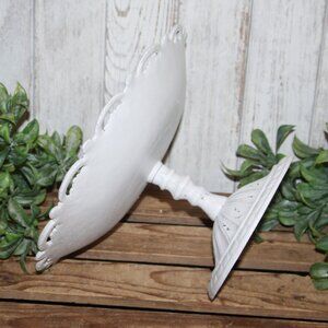HEAVY vintage 6.75" tall x 12" cast iron pedestal plate dish with ornate open designs around edges and a fruit motif at center. Shabby white finish with just a few little chippy spots. ⭐️ SOLD AS IS ⭐️ Perfect for Shabby Chic, French Country or Farmhouse cottage decor!