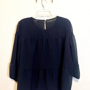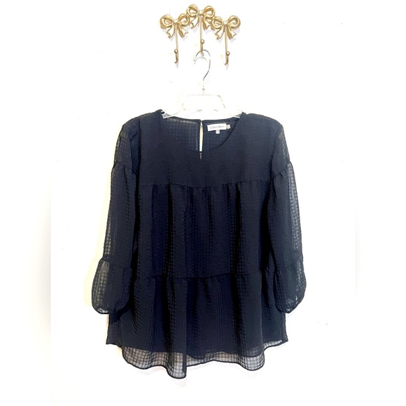 This Calvin Klein blouse showcases a relaxed, tiered silhouette with elegant bell sleeves, offering a chic and comfortable style. The rich black color enhances its sophisticated appeal, while the 3/4 sleeve length provides versatility for various occasions. Crafted from a light and airy fabric, this top ensures both style and comfort. 100% polyester