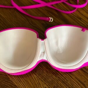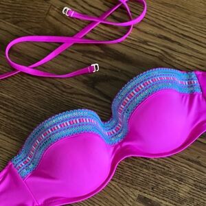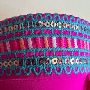 Bright pink halter bikini top with colorful embroidered details. Perfect for a stylish beach day. It’s beautiful!!! You will love to have it. Underwire, removable straps. Can be wear with straps or not.