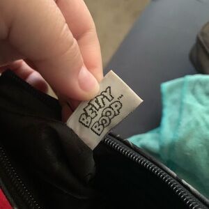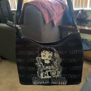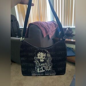 Stylish black shoulder bag featuring Betty Boop design. Perfect for casual outings.