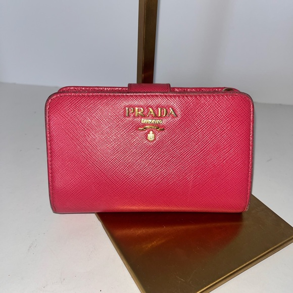 This elegant Prada wallet showcases a vibrant pink saffiano leather, known for its durable cross-hatch texture. The compact zip-around design is adorned with the iconic gold-tone Prada logo, making it a stylish and practical accessory for any occasion. Usted in good condition.