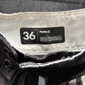 EUC Men's 36" Hurley Board Shorts Black and Gray Hawaiian Tropical Leaves pattern. Approximate measurements: waist 19.5" x length 21". Velcro back pocket with "swim leash" (see last pic).