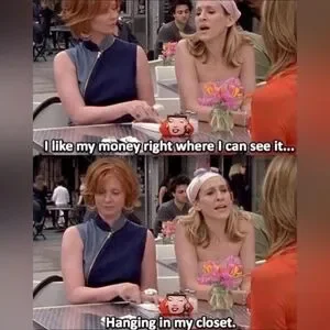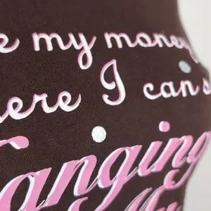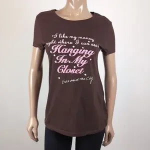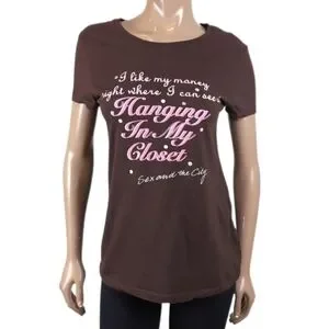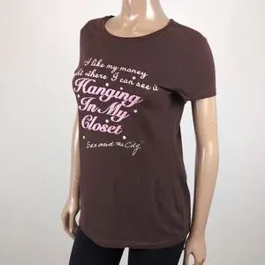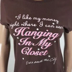 Y2K era licensed top with the famous Carrie Bradshaw quote accented with glitter. 100% cotton.