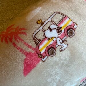 Soft Peanuts blanket with Snoopy and van design. Features pink and tan colors. Plush and cozy. In excellent condition