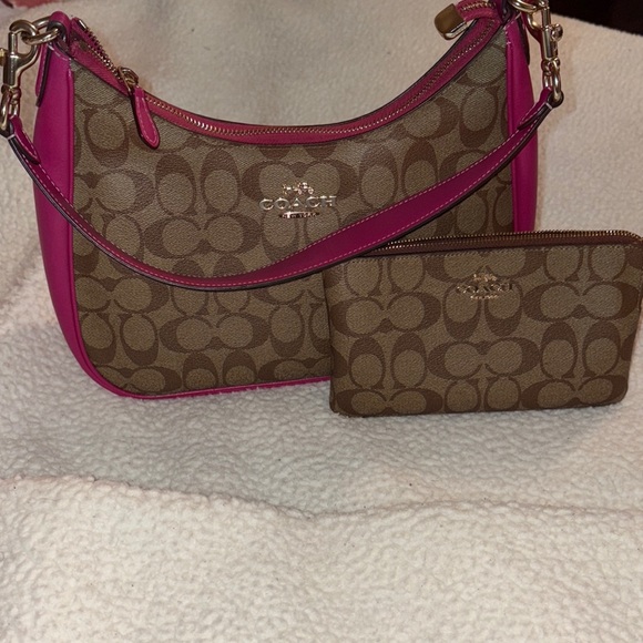Elevate your style with this Coach bag set featuring a chic pink and brown design. Perfect for any occasion, this set combines elegance and functionality.