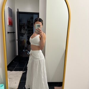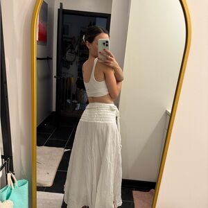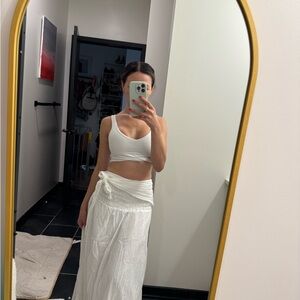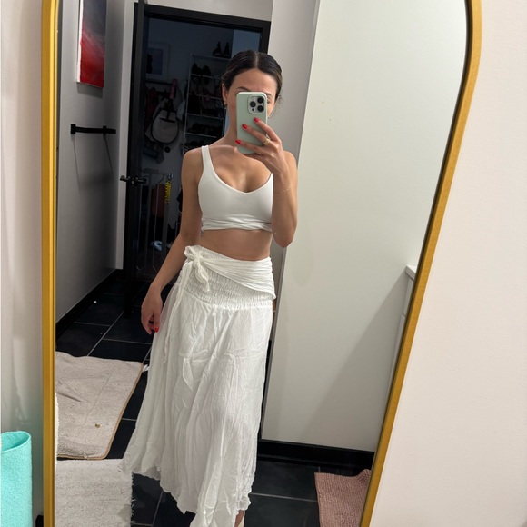 Bought in Mykonos last summer. Only wore during vacation, in great condition. Versatile- can wear as a skirt or dress. This skirt doesn’t have a size. I believe it’s a one size fits all, just by how stretchy it is. I am an XS and fits great but can definitely fit larger sizes.